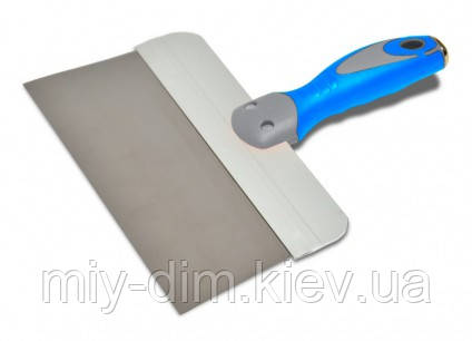 Шпатель сталевий з нержавіючим покриттям. Двокомпонентна ручка з отвором для підвішування. Призначається для нанесення і розподілу будівельних сумішей при оздоблювальних роботах.